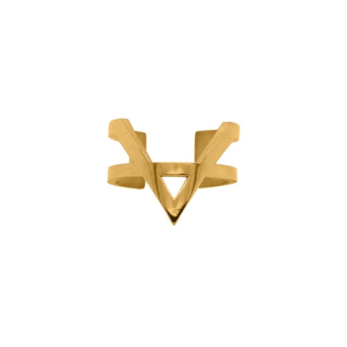 This ring has a circular format composed of two bands, crafted in a “V” format, as an arrow on the upper part. It features a flat, plain surface and a shiny yellow glow, natural to gold.