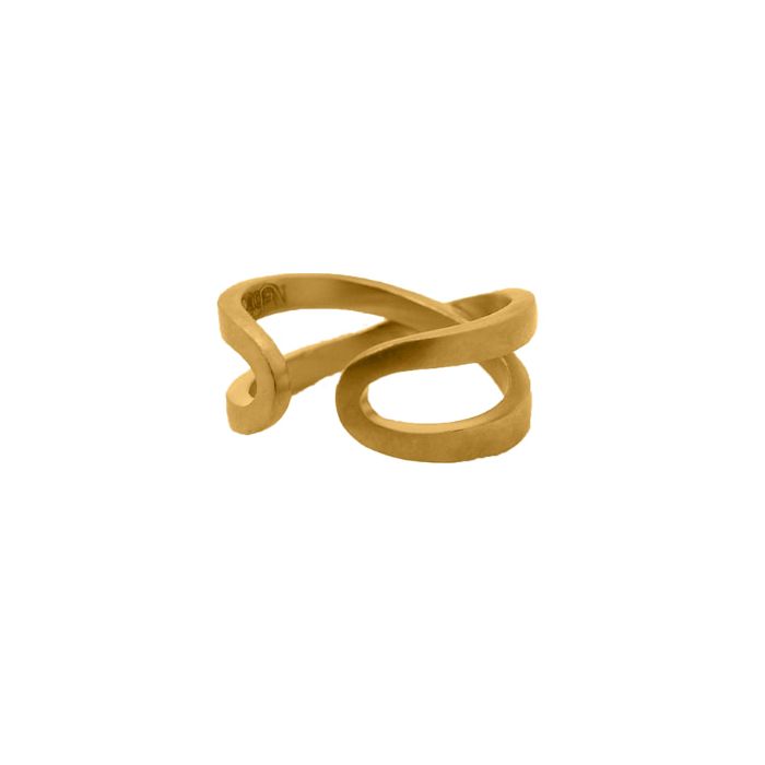 This ring has a circular format composed of two crossed bands that form the infinity symbol. It features a flat, plain surface and a shiny yellow glow.