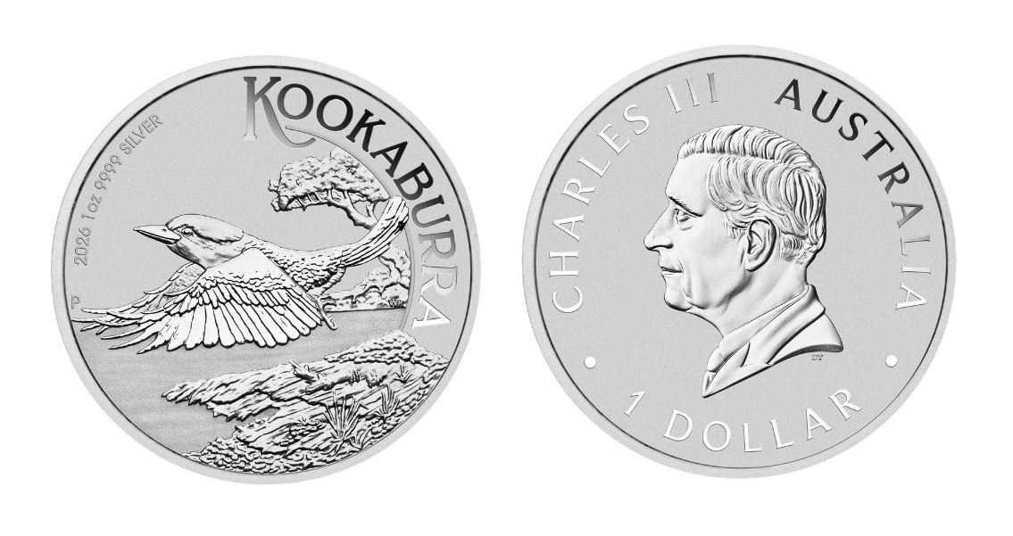 The reverse side features the Kookaburra, a native Australian bird, with the inscriptions “KOOKABURRA,” a “P” on the right for the mintmark, and the coin’s information regarding the year of mintage, weight, fineness, and metal content described as “2026 1 oz 9999 SILVER.”