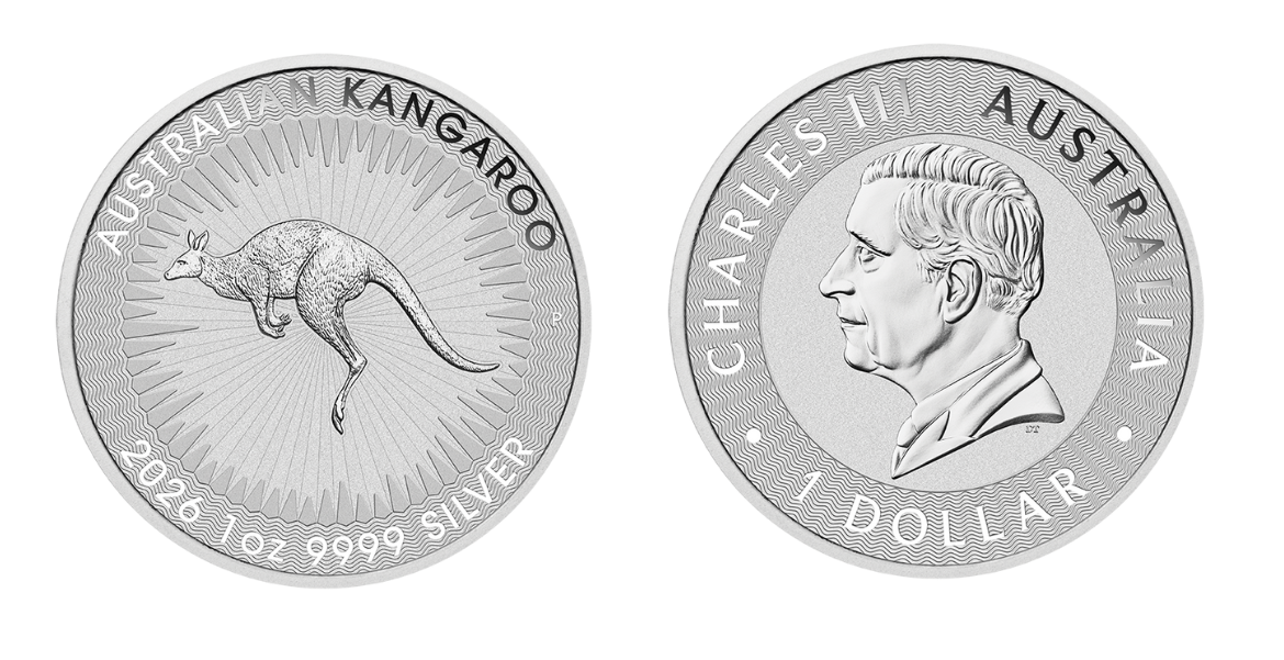The reverse features a hopping Kangaroo, with radial lines in the background. The inscriptions follow as “AUSTRALIAN KANGAROO,” the coin’s year of issuance, weight, metal content, fineness, and year of issuance, described as “2026 1 OZ 9999 SILVER.”