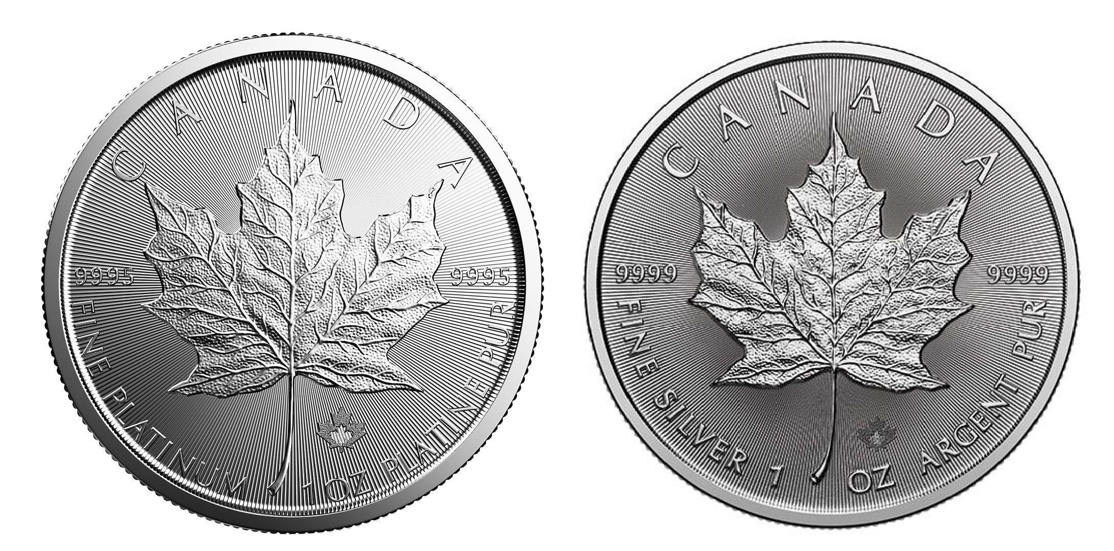Interestingly, some high-purity coins can look almost identical; for example, compare the Canadian Maple Leaf struck in .9995 platinum with the one struck in .9999 silver—they can appear very similar at a glance.