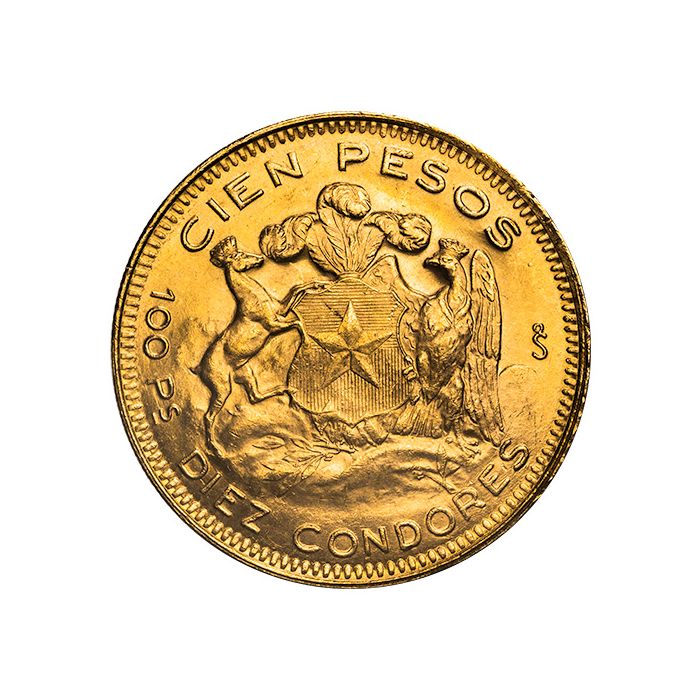 The 100 Pesos is a Chilean gold coin produced by the Santiago Mint from 1926 to 1980.