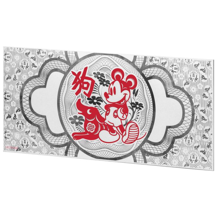 The reverse sides of these banknotes feature perhaps the most beloved Disney character to date, Mickey Mouse. A stylized dog accompanies him, while the Chinese character for dog hovers above the image.