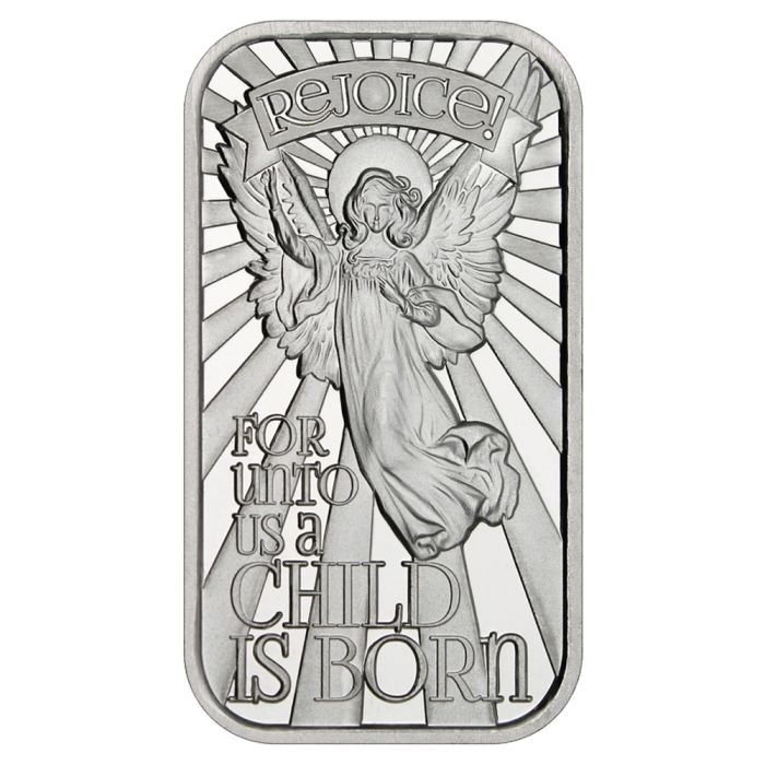 Buy Holiday Christmas SilverThe Angelic announcement of Jesus’ birth is one of the most awe-inspiring stories from the Bible. Depicting this classic scene on a brilliant silver bar, SD Bullion is proud to offer these 2017 1 oz Rejoice A Child is Born Silver Bars just in time for the holiday season. Struck by SilverTowne Mint, this silver bar displays complicated and detailed designs that infuse life into the scene. One side of the bar showcases the image of an Angel descending from heaven as he announces the birth of Jesus. The words ‘Rejoice! For unto us a Child is Born’ are sprawled across this side too. Each of these bars contains 1 troy ounce of 0.999 pure silver. Hence, these products not only remind you of the true meaning of Christmas and these holidays, they allow you to expand your investment portfolio as wellSnag these 2017 1 oz Rejoice A Child is Born Silver Bars and kickstart your holiday purchases with a sound silver investment and a design that celebrates Christmas the right way.