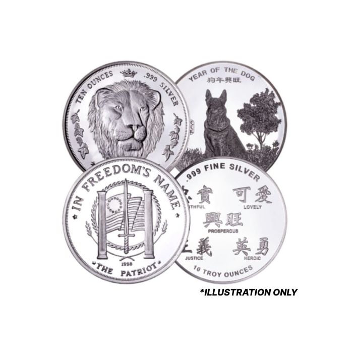 This purchase option can fit those interested in significant amounts of physical silver without caring about brands. We cannot guarantee any specific brand through the generic option. They are determined at the time of shipping, according to our inventory availability. But we guarantee a 10-troy ounce silver round at the lowest premium price.