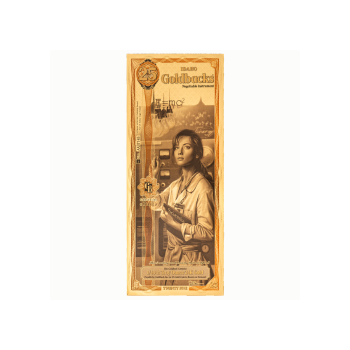 Goldback notes feature a female figure representing a specific virtue. The Idaho 25 Goldback embodies Scientia, the virtue of knowledge, commemorating Idaho’s pioneering achievements in nuclear energy. In 1951, a reactor in Arco, Idaho, became the first in the world to generate electricity from nuclear power, and a few years later, another reactor powered the entire town, marking a historic milestone.
