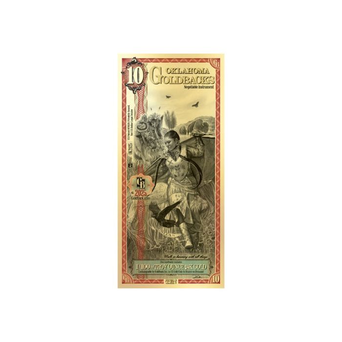 Introducing the Oklahoma 10 Goldback Note, a striking release from the Aurum Mint, containing 1/100th Troy oz of 24k gold with a powerful design honoring Oklahoma’s Indigenous heritage and the virtue of Unitas, or Unity.