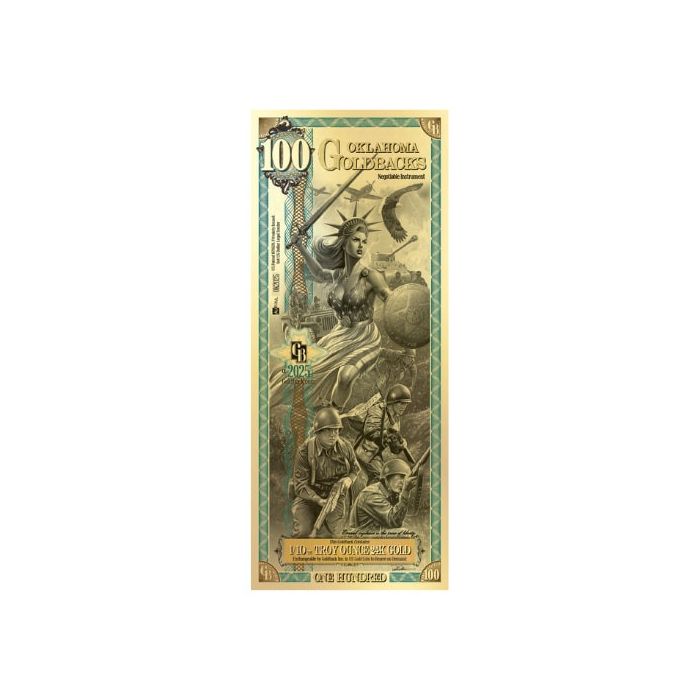 The Oklahoma 100 Goldback Note is the highest denomination in the state’s series and contains 1/10th troy ounce of 24-karat gold. This stunning note honors the virtue Libertas, or Liberty, and pays tribute to Oklahoma’s courageous role in defending freedom, particularly through the legacy of the 45th Infantry Division during World War II.