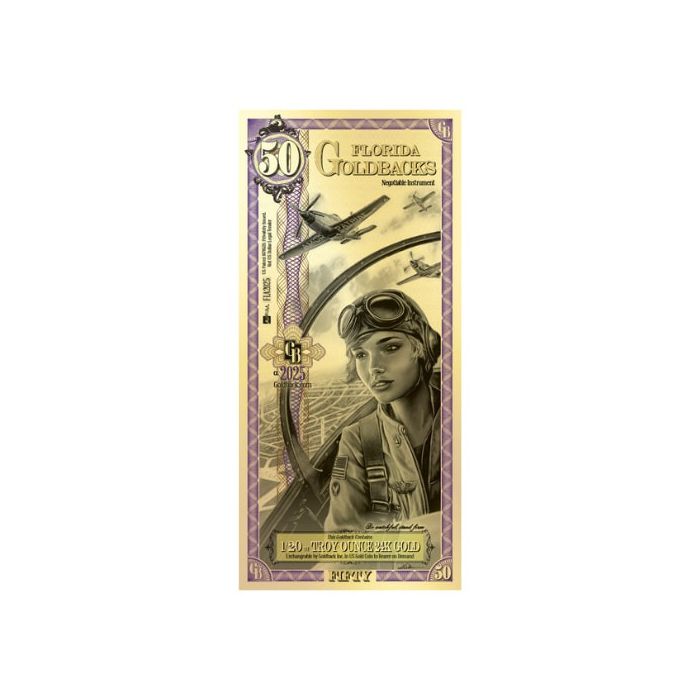 The Florida 50 Goldback represents the virtue “Amor Patriae,” which in Latin stands for “Love of Country.” The design portrays a Women’s Airforce Service Pilot (WASP) flying a P-51 Mustang over Hendricks Army Airfield, honoring the patriotism and bravery of women who served during WWII and Florida’s 1.5 million veterans.
