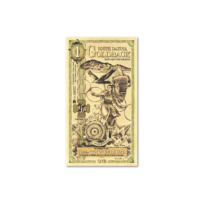 The “1” monetary denomination is on top, beside the inscription “SOUTH DAKOTA GOLDBACKS.” The note’s weight and metal content are at the bottom.