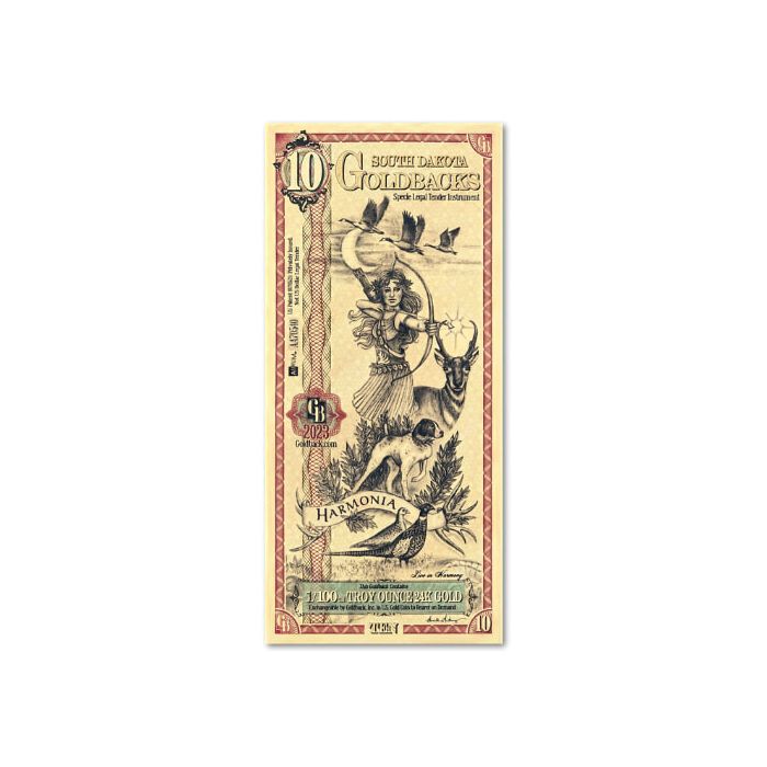 The South Dakota 10 Goldback Note presents the virtue of Harmonia, the Greek goddess of harmony, surrounded by some animals like birds, a dog, and a deer, ready to shoot a bright arrow from her bow.