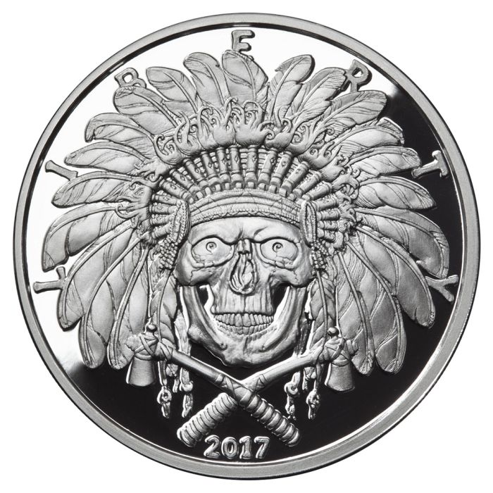 On the other hand, the obverse faces showcase yet another skull design – wearing a traditional Native American headdress of a Chieftain. The year of issue ‘2017’ and the word ‘LIBERTY’ are also featured on this side.