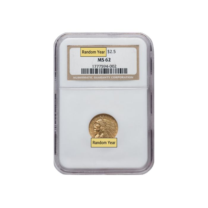Through this purchasing option, SD Bullion costumers are guaranteed to receive an authentic $2.50 Indian Quarter Eagle Gold Coin, certified by NGC as MS-62 coins. Dates will be randomly selected at the time of shipping according to our inventory availability.