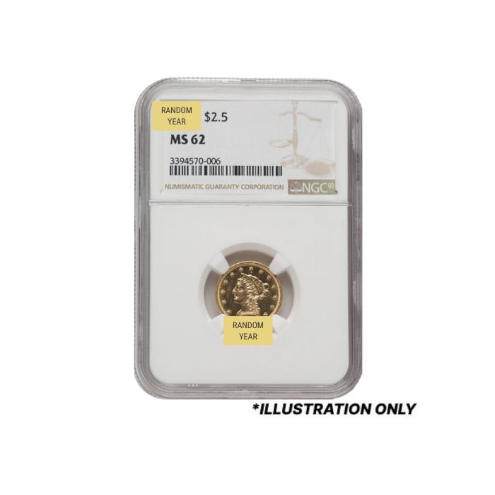 SD Bullion offers $2.50 Liberty Quarter Eagle coins of varied mintage years, sealed and graded by NGC as MS-62 coins.