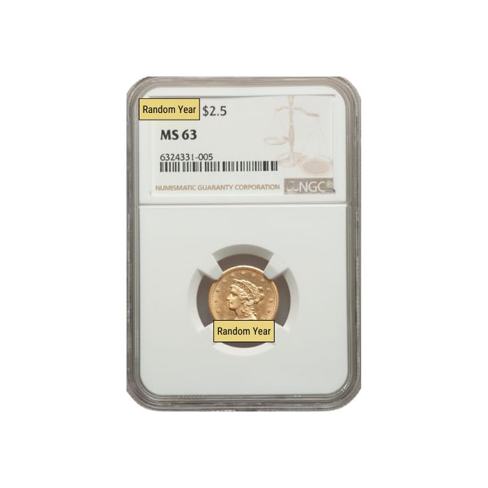 Through this purchase option, clients can acquire authentic $2.50 Liberty Quarter Eagle Gold Coins, certified by the NGC as MS-63 coins. However, their mint years are variable and randomly selected at the time of shipping according to our inventory availability.