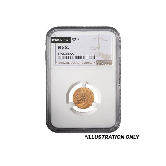 SD Bullion offers $2.50 Indian Head Quarter Eagle Gold Coins of varied mintages sealed in NGC slabs and certified as MS-65 samples, randomly selected from our stocks.