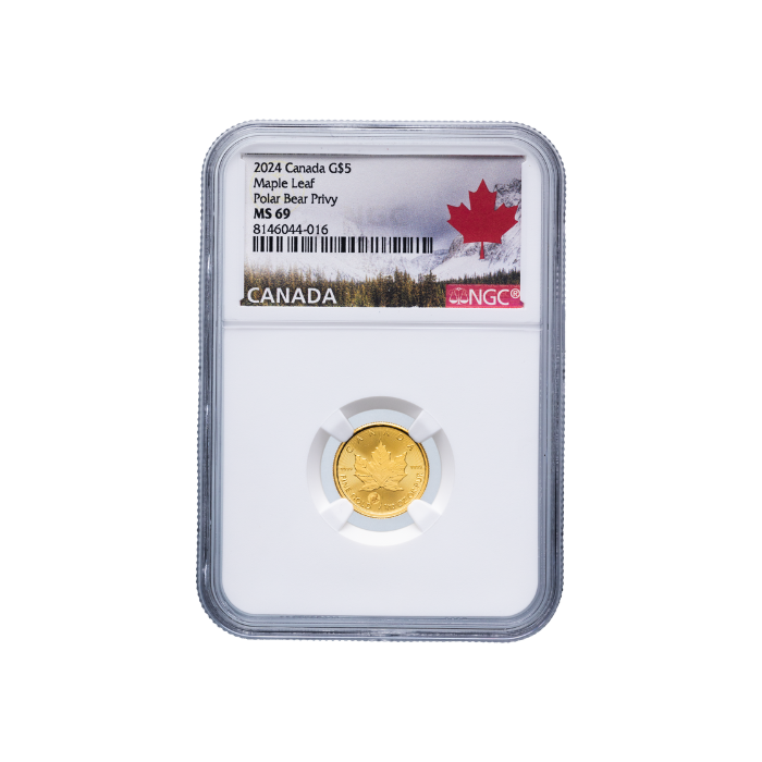 Today, at SD Bullion, you can purchase a 2024 1/10 oz Canadian Gold Maple Leaf Coin with the Polar Bear Privy Mark, sealed in NGC slabs and certified as an MS-69 coin.