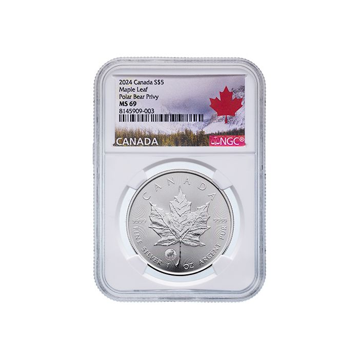 Today, you can purchase 2024 1 oz Canadian Silver Maple Leaf Coins with the Polar Bear Privy Mark, sealed in NGC slabs and certified as MS-69 coins.