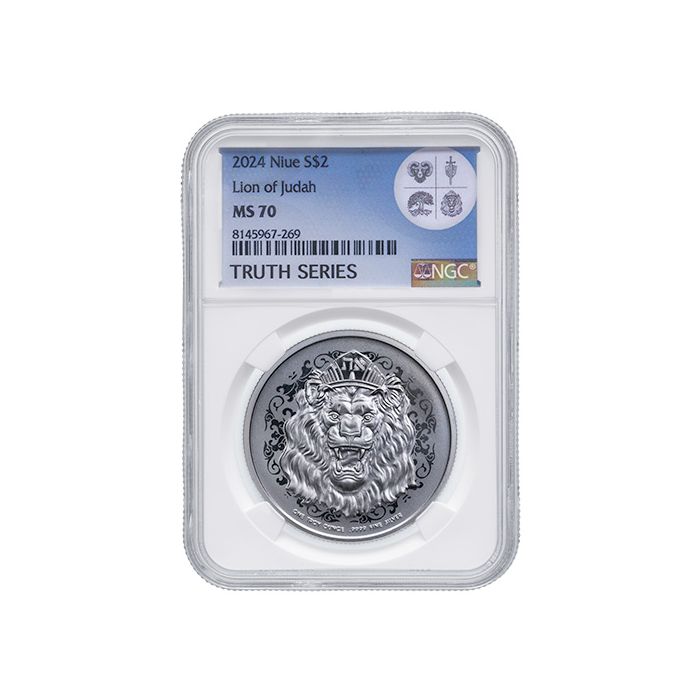This Roaring Lion coin is part of the 2024 edition. It contains 1 Troy oz of 99.99% pure silver, is sealed in an NGC slab, and is certified as a perfect MS-70 sample.