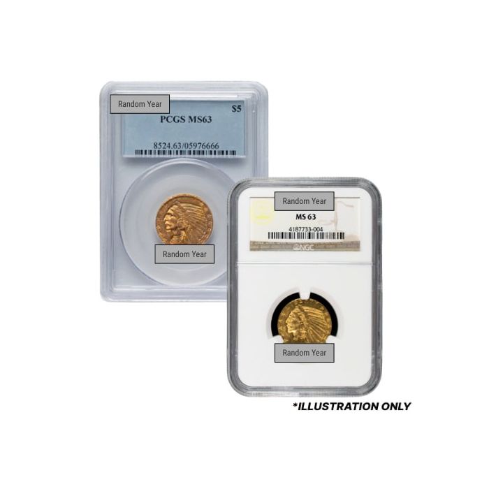 SD Bullion offers $5 Indian Head Half Eagle gold coins of varied years, graded as MS-63 by either NGC or PCGS, of varied mintage, randomly selected from our inventory at the time of shipping.