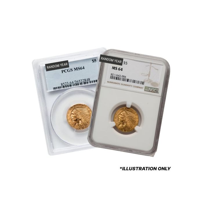SD Bullion offers $5 Indian Head Half Eagle gold coins of varied years, graded as MS-64 by either NGC or PCGS, of varied mintage, randomly selected from our inventory at the time of shipping.