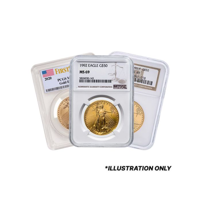 Today, you can purchase from Graded US Gold Eagles, certified as MS-69 coins by either the NGC or the PCGS. However, their mintage years and seals, if NGC or PCGS, may vary according to our inventory availability;