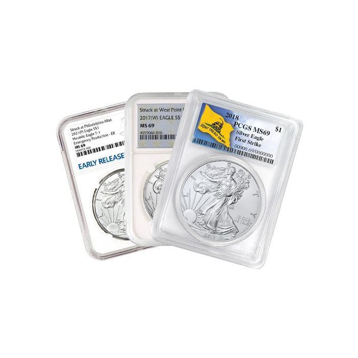 American Eagles are the official bullion coin in the US and the most popular silver coin on the market. Graded silver eagles have been guaranteed by the Numismatic Guaranty Company or the Professional Coin Grading Service as authentic and given a grade based on how many imperfections they contain. MS-69 coins are guaranteed to be, “A fully struck coin with nearly imperceptible imperfections.” and is the second highest score a coin can receive.