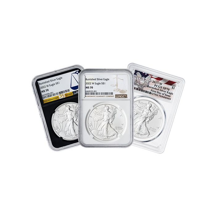 Today, SD Bullion offers 1 oz Burnished American Silver Eagles, either graded as MS-70 by NGC or SP-70 by PCGS. They may be of varied mintages and seals, randomly taken from our stocks, according to your availability at the time of shipping.
