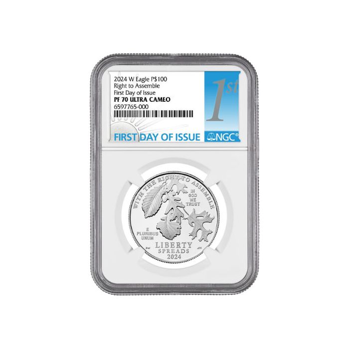 The 2024 obverse design assembles several types of oak leaves, symbolizing the Right of Assembly. The image is accompanied by the engravings “WITH THE RIGHT TO ASSEMBLE LIBERTY SPREADS,” “IN GOD WE TRUST,” “E PLURIBUS UNUM,” and “2024.”