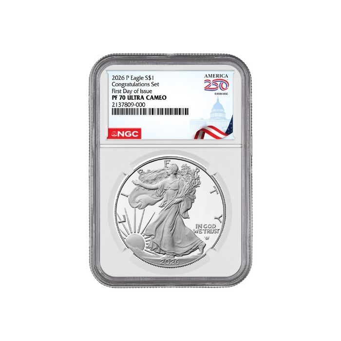 The NGC PF-70 First Day of Issue 2026-P 1 oz American Silver Eagle Congratulations Proof - 250 Label marks a historic release in the world’s most popular silver coin series. Issued during the 250th Anniversary of American Independence, this coin combines the prestige of the American Silver Eagle with a flawless proof grade and a special commemorative label honoring this once-in-a-generation milestone.