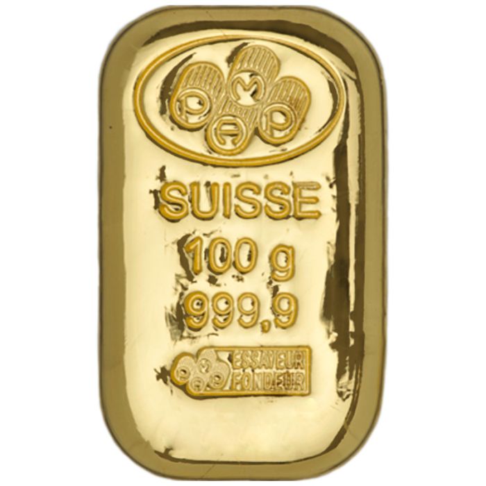 This PAMP Suisse gold bar contains 100 grams (3.215 oz.) of 0.9999 pure AU (gold) and each bar is cast individually with the utmost care. These bars are eligible for use in precious metal IRAs (Individual Retirement Accounts) too, hence making them prized from an investment standpoint.