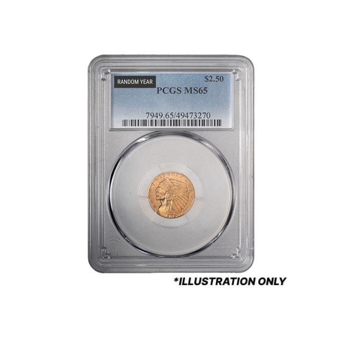 SD Bullion offers $2.50 Indian Head Quarter Eagle Gold Coins of varied mintages sealed in PCGS slabs and certified as MS-65 samples, randomly selected from our stocks.