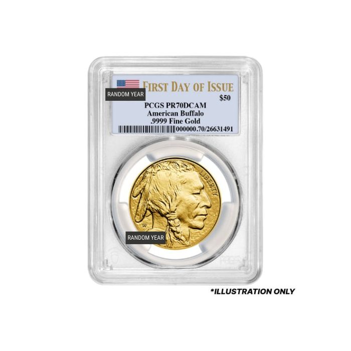 SD Bullion guarantees clients receive an authentic 1 oz American Gold Buffalo Coin, sealed by PCGS as PR-70 samples. These coins are randomly selected according to our inventory availability during shipping. Therefore, they may have varied mintage years.