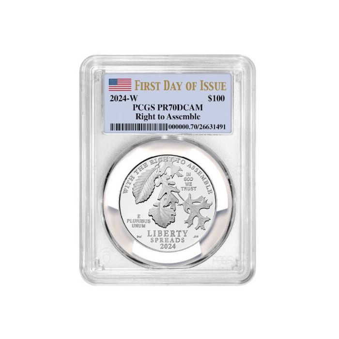 This series is a commemorative edition that strikes annual platinum proof coins showcasing one of the five freedoms ensured by the First Amendment. The 2024 edition features the Right of Assembly and is the fourth strike of the series.