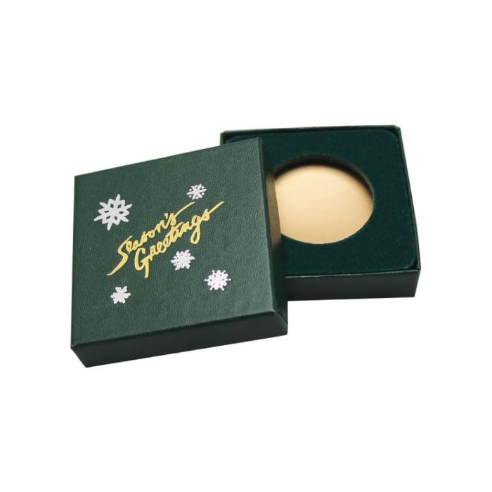 This is an excellent addition for anyone looking to give the gift of precious metals this year! Each box purchased includes the Season's Greetings Green Display Box and green insert that holds a 39 mm Air-Tite Capsule.