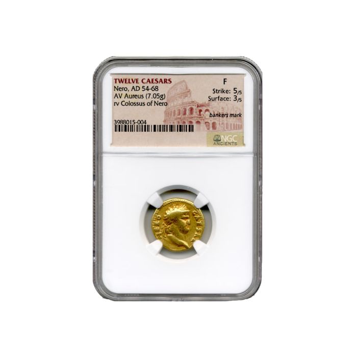 No coin collection is perhaps as desirable as the Twelve Caesars set of gold coins from the Roman Empire. These Twelve Caesars Nero AD 54-68 Gold Aurei (Roman monetary unit) have been certified by NGC (Numismatic Guaranty Corporation). Bearing a grade of ‘F’ for ‘Fine,’ the coins are sealed into a familiar NGC plastic slab for protection from damage and tampering.